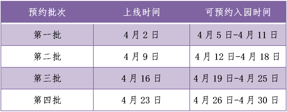 四个批次的紫藤公园电话预约启动时间安排如下