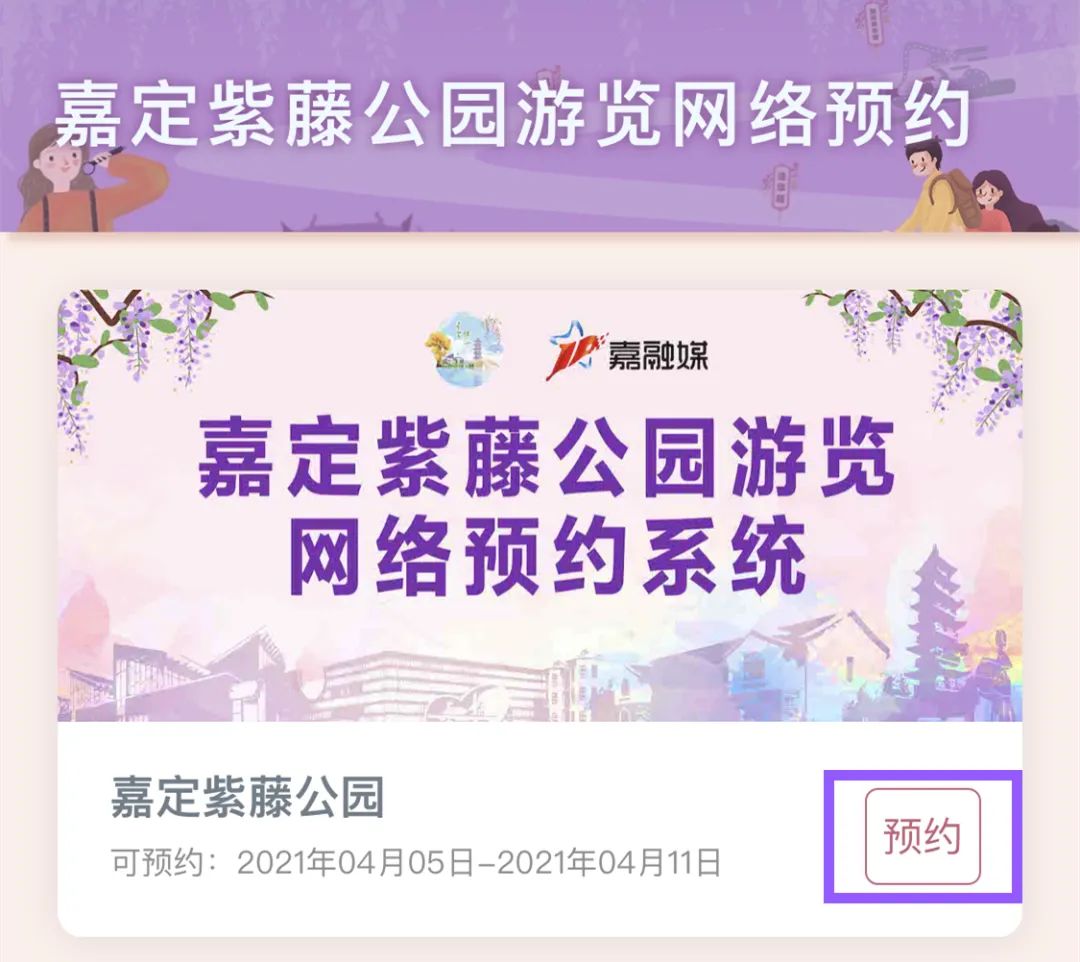 2、在“上海嘉定”APP首页,进入“嘉定紫藤公园游览网络预约系统”点击“预约”