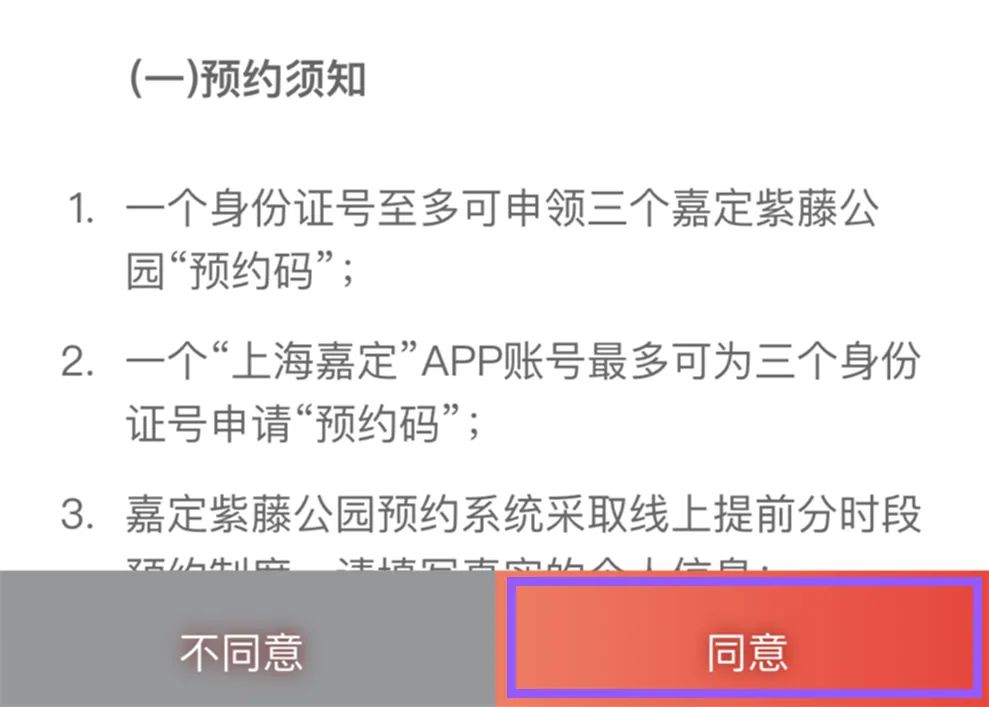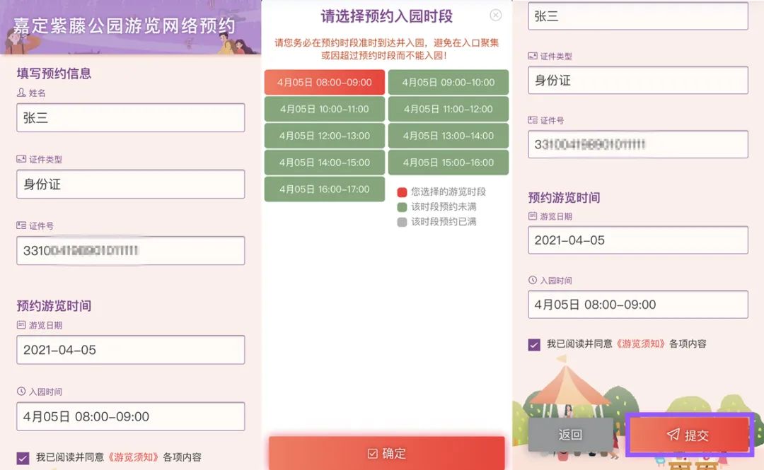 4、嘉定紫藤公园预约系统采取线上提前分时段预约制度,请填写真实的个人信息;