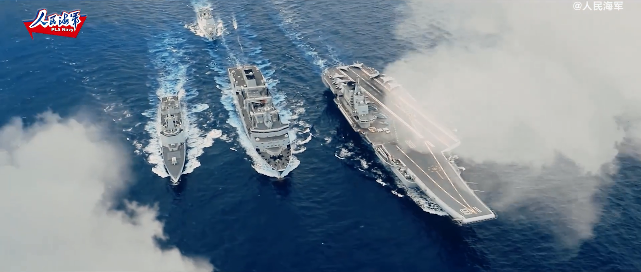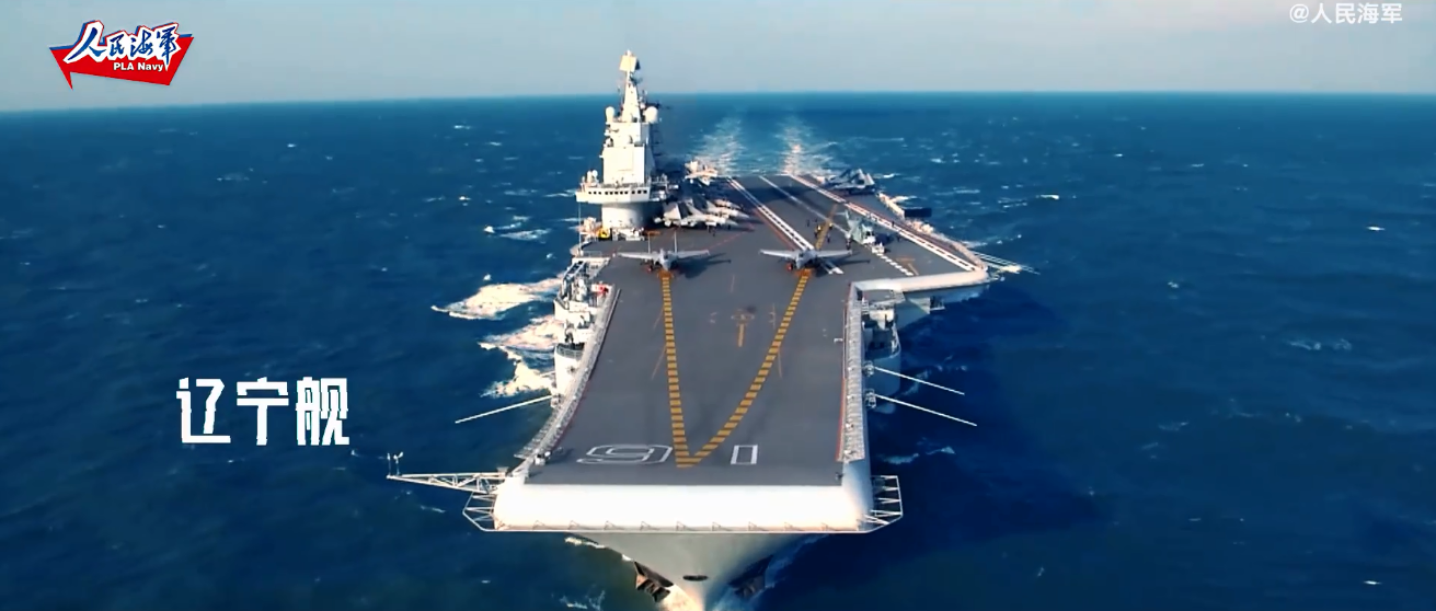 在宣传片开头处,中国首艘航母辽宁舰组成编队踏浪而来。第一排从左至右,我们可以看到“万吨大驱”055型驱逐舰、“航母奶妈” 903型补给舰和辽宁舰,后方还有一艘052D型驱逐舰。