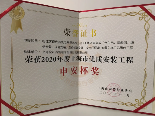 “申安杯”优质安装工程奖是上海市安装工程质量最高奖,代表当前上海市安装技术和质量的最高水平。此次获奖是对松江有轨电车T1线四电集成安装工程安全可靠的认可,也是松江有轨电车持续推进高质量工程管理的动力。