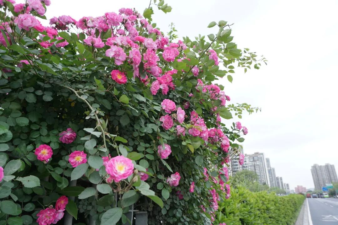 漫步桂江路上,姹紫嫣红、姿态万千的月季随处可见,一朵朵相互交织,已然形成芬芳满园的华美图卷,令人流连忘返。