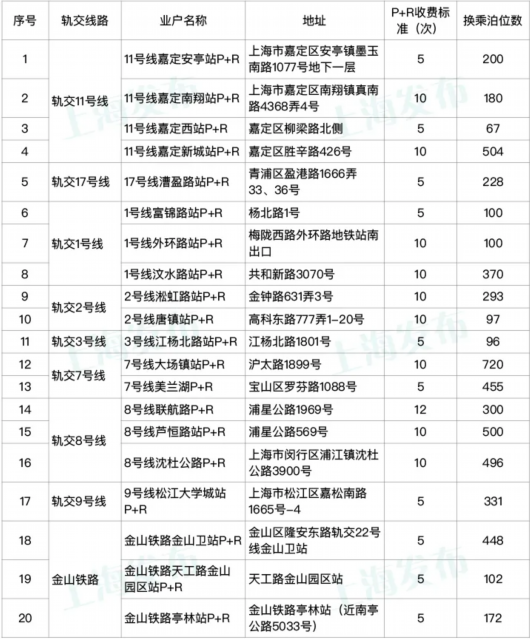 目前,本市P+R换乘停车场总计20处,涉及9条轨交线路,总计提供换乘泊位5759个。临近内环线周边轨交站点早晚高峰泊位较充足的停车场(库)共有31处。