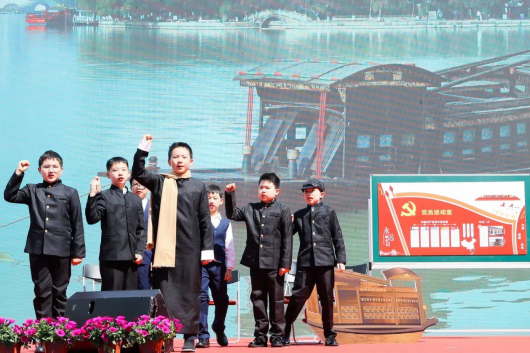 4月26日,福山外国语小学外语节文化周开幕式上,来自中共一大会址纪念馆的党史研究专家李欣桐伸出大拇指,为福山外国语小学数千师生党史学习教育的成果点赞。她还向福娃发出邀约:“欢迎到纪念馆担任小小宣讲员,推广你们的学习成果,参与更多活动!”
