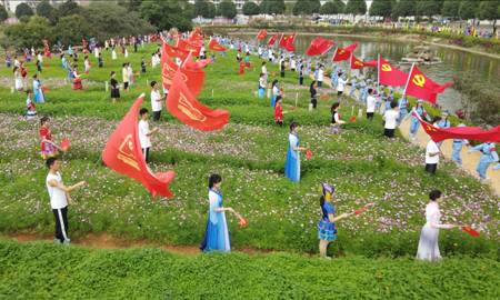 当晚,文艺晚会在开场歌舞《春暖花开三月三》中拉开帷幕。整场晚会分为“壮乡欢腾三月三”“民族团结忆百年”“不忘初心颂党恩”三个篇章,演员们身着各具特色的各民族服饰,唱着山歌颂党恩,踏着舞步庆佳节。在壮族舞蹈《天稻琴声》、天琴弹唱《遇见壮乡》、瑶族舞蹈《云端上的梦》节目表演中,我们领略到民族歌舞、民族乐器与民族风情的交融;《百年征程歌曲联唱》、《独弦琴合奏<京岛渔歌><唱支山歌给党听>》、合唱建党百年MV《少年》、歌舞《不忘初心》等节目陆续上演,在歌声中、书画里,重温党的光辉历史,讴歌党的百年伟大成就;在党的领导下,脱贫攻坚战取得了举世瞩目的成就,歌曲《老百姓说好才是真的好》唱出了广大百姓的心声;朗诵《面对鲜红的党旗》带我们回望党的百年征程,歌颂无数为人民抛头颅、洒热血的革命先烈;晚会在大合唱《没有共产党就没有新中国》的歌声中圆满落幕,全体师生挥动着红旗,齐声高唱,祝福党、祝福祖国。