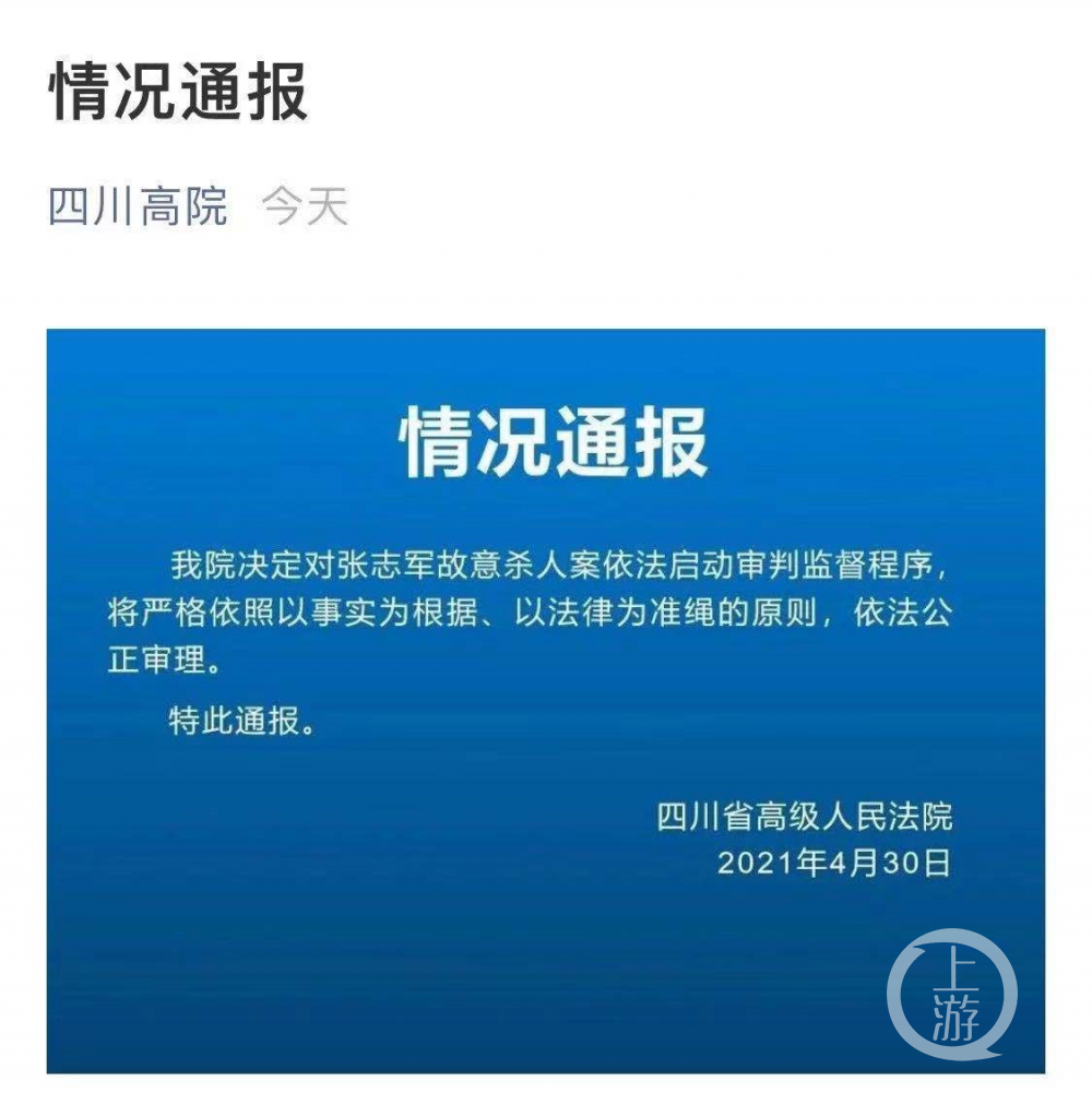 4月30日,上游新闻(报料微信号:shangyounews)记者从四川高院获悉,四川高院决定对张志军故意杀人案依法启动审判监督程序,将严格依照以事实为依据、法律为准绳的原则,依法公正审理。