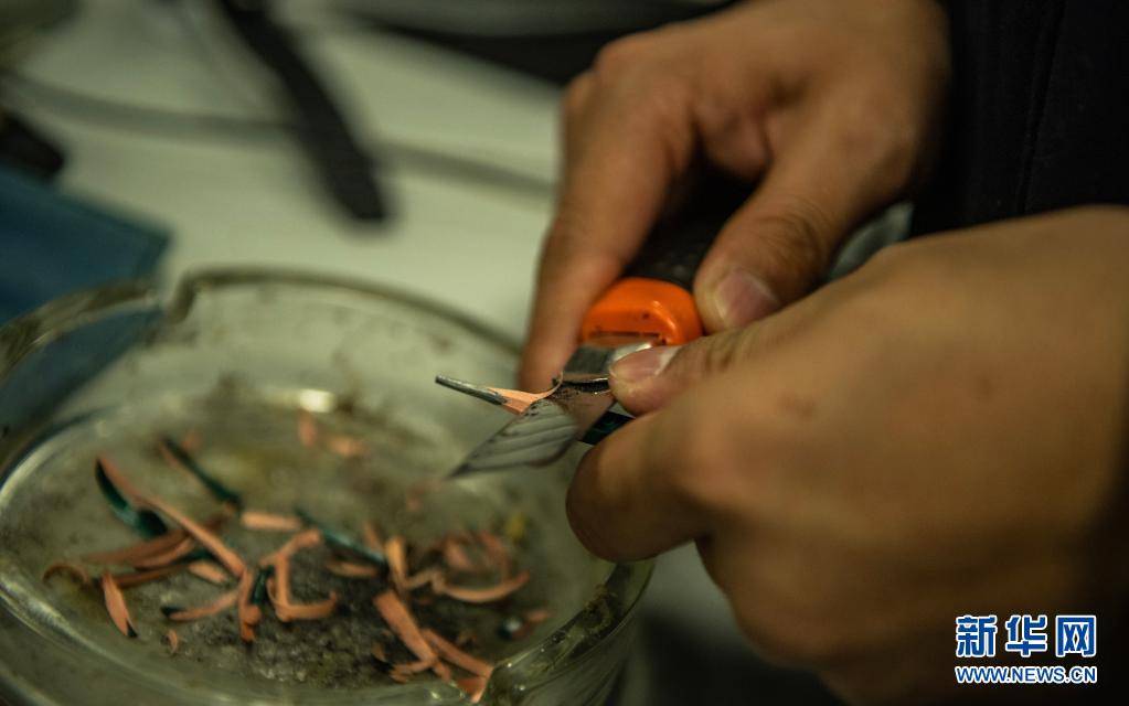 朱允宏在削铅笔(5月2日摄)。新华社记者 陶亮 摄