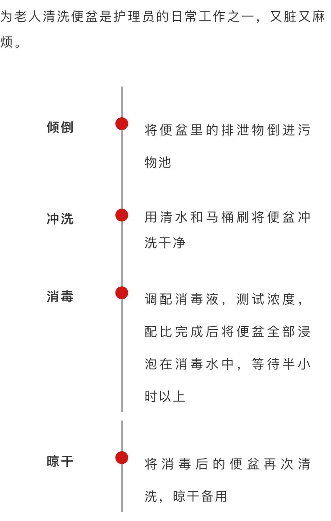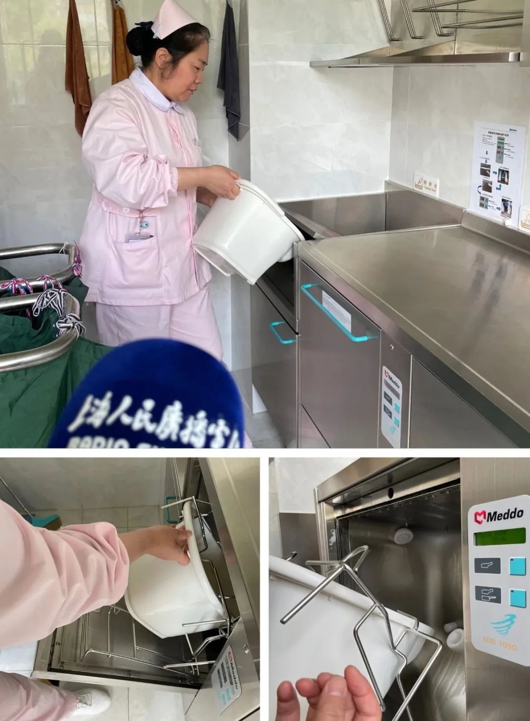 如今,院内配备了“污物处理系统”:粪便倒入倾倒池后会被水直接冲走,然后护理员会将便盆放入消毒机,调节合适的档位,设备就会自动冲洗、高温消毒。结束后系统会亮灯提示,护理员将便盆取出,悬挂回储纳柜即可。整个过程也就10分钟,不用护理员操心照看,而且更加干净卫生。