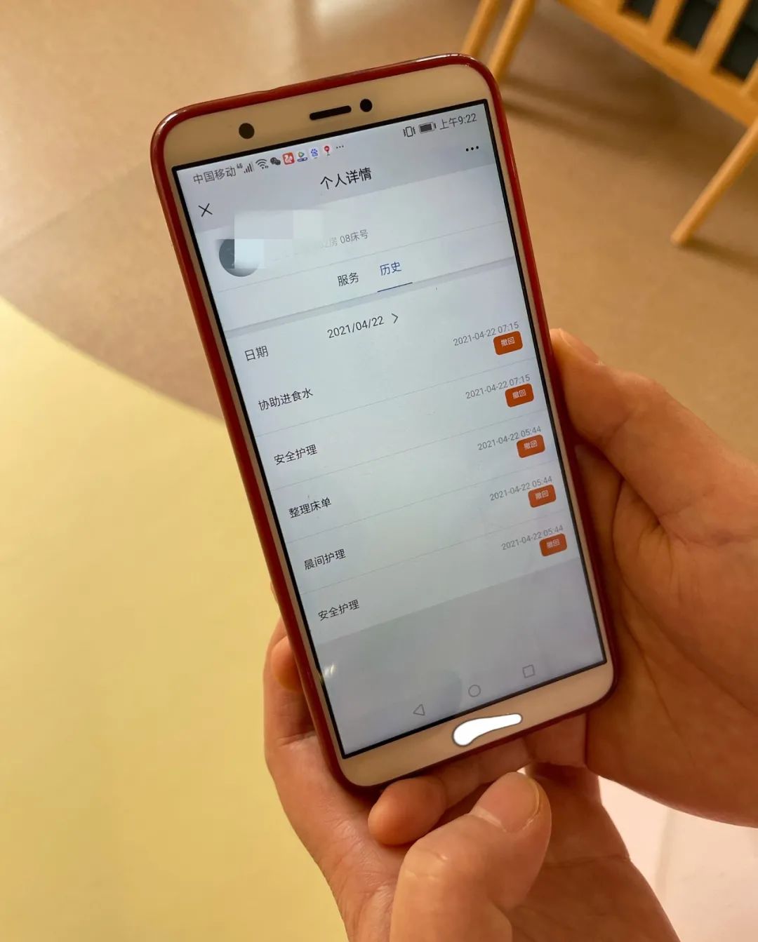 手机是赵婕和同事如今最贴身的工具,今年春节前院内上线了“养老平台”小程序,每位护理员每天服务每位老人的情况,都要事无巨细地及时录入平台。