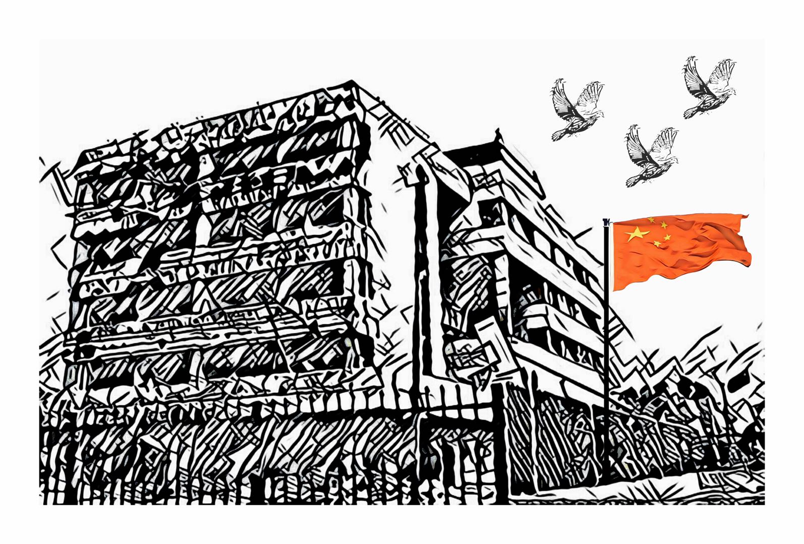 1999年5月,中国驻南斯拉夫联盟大使馆在北约轰炸南联盟时被炸毁的馆舍前,一面中国国旗高高飘扬。