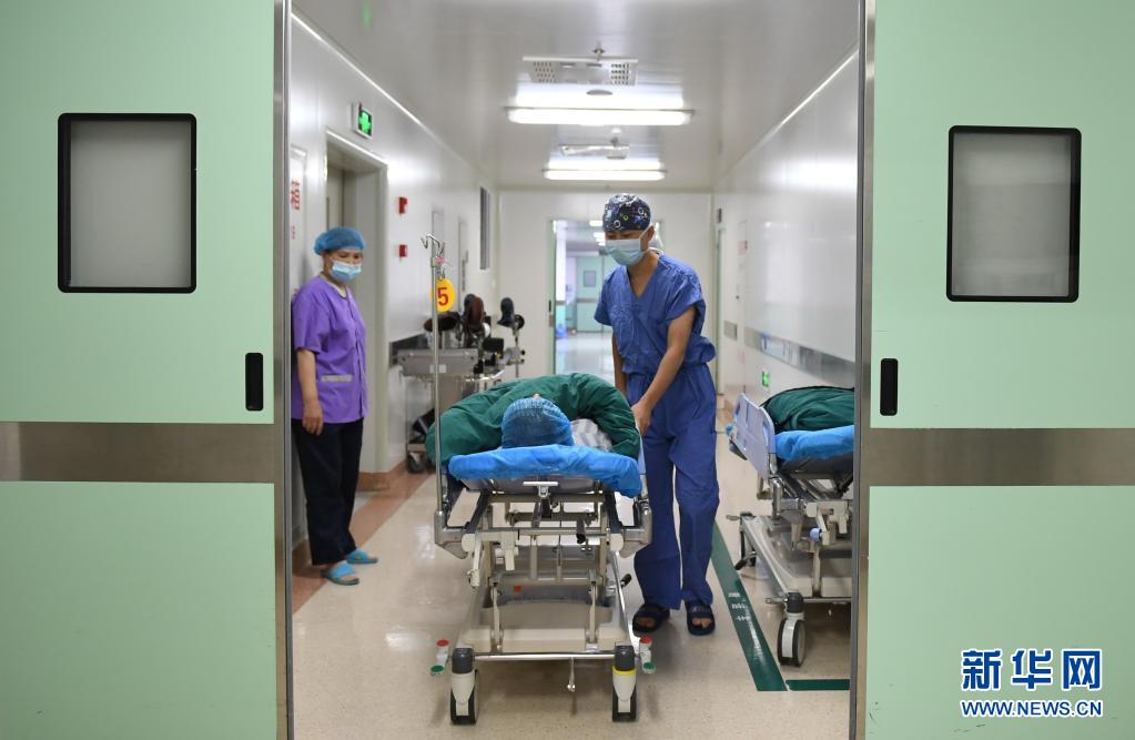 5月10日,福建中医药大学附属第二人民医院主管护师张志恩(右)推着患者进入手术室。