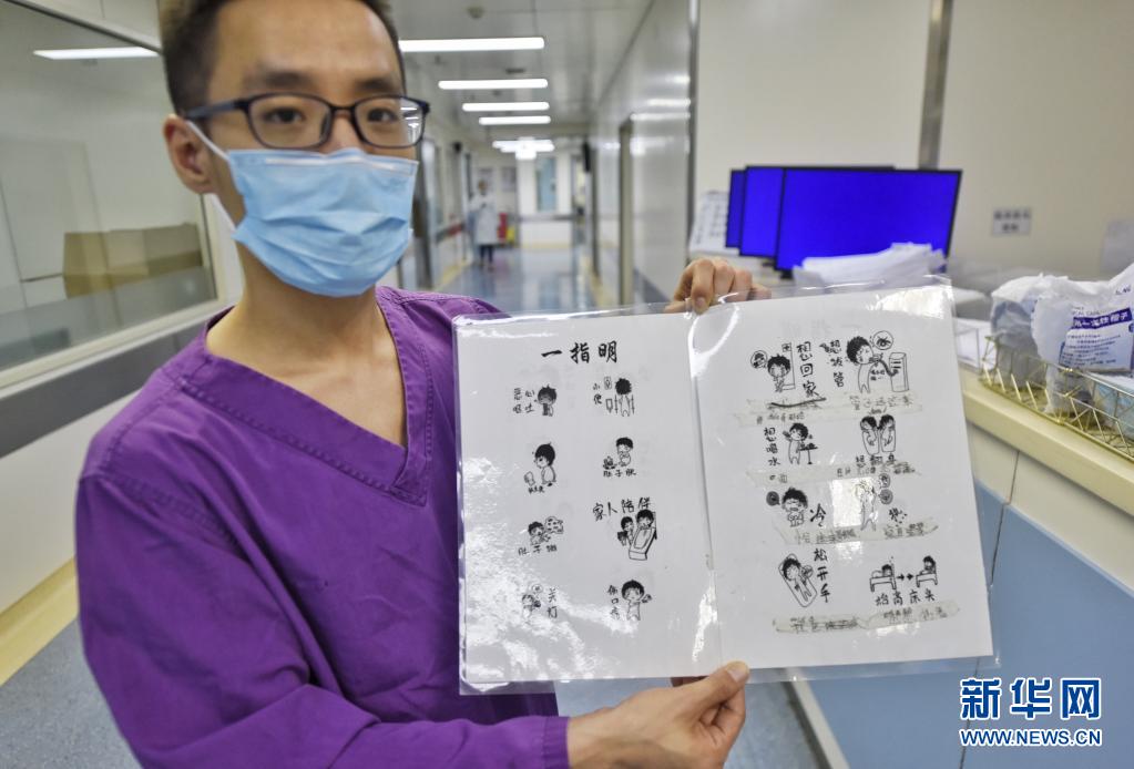 5月10日,刘鑫在四川省肿瘤医院ICU病房内展示为方便患者而绘制的“一指明”。新华社记者 刘坤 摄