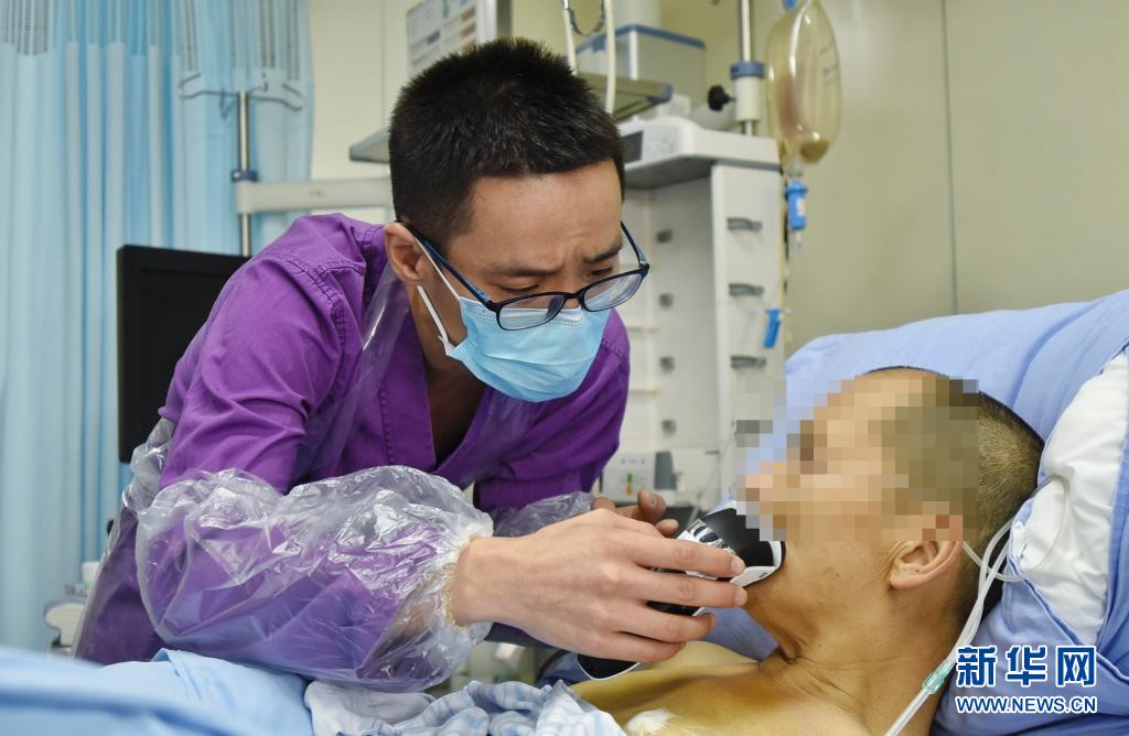 5月10日,刘鑫在四川省肿瘤医院ICU病房内为一名病人剃须。新华社记者 刘坤 摄