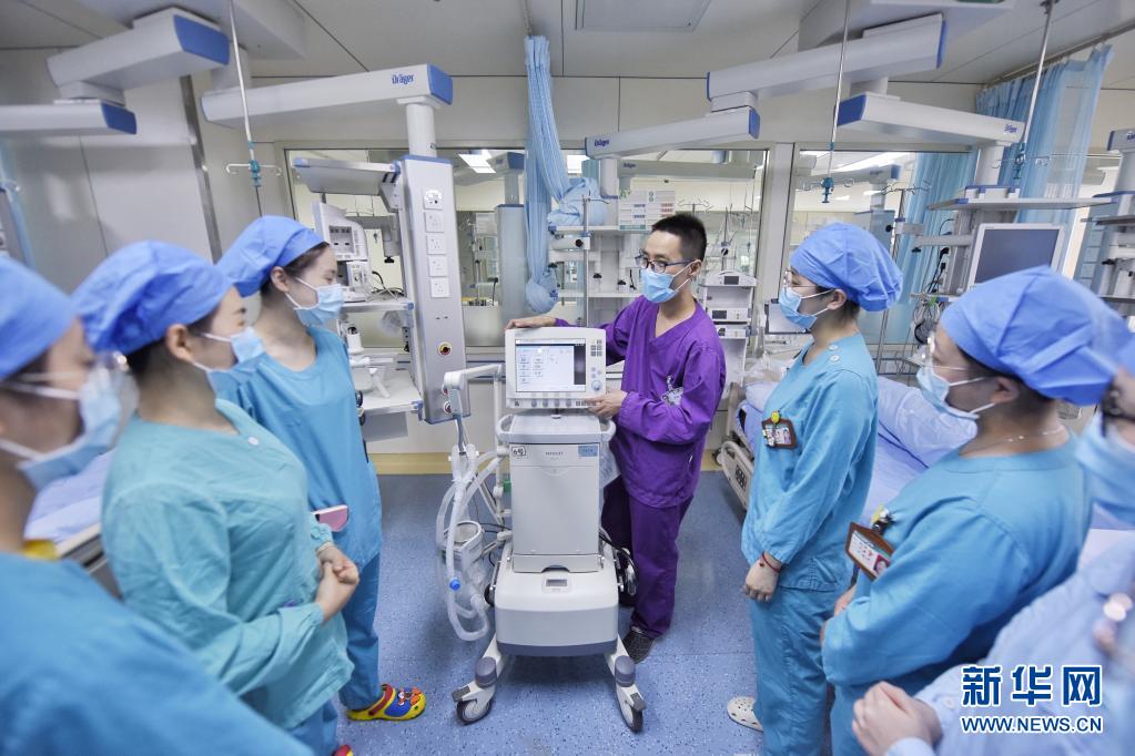 5月10日,刘鑫(中)在四川省肿瘤医院ICU病房内对新入职护士进行临床教学。新华社记者 刘坤 摄