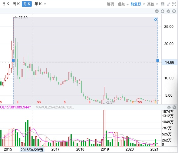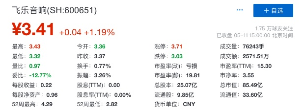 从上市以来历史走势看,飞乐音响在2015年6月创下27.89元的高点,随后股价一路下跌,至今年5月11日,收盘报3.41元/股,5年多股价跌幅达81.18%,总市值只有85.49亿元。意味着,5年多来总市值缩水了超420亿元。