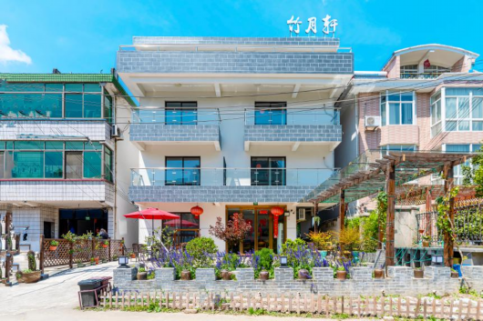 月夕民宿在渔村一排白墙黛瓦的民居间,是一幢三层高的小楼。一楼有一个大院子,摆放着几张桌椅、秋千,院墙边种着几棵大树以及许多花木盆栽。