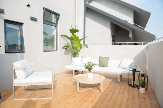 在金山嘴渔村老街的深处,有一幢带庭院的三层民宿,这便是九里小院。院子里白色的沙石、仿崖石的墙壁以及日式的家居装饰,带来客人时尚浪漫的气息。