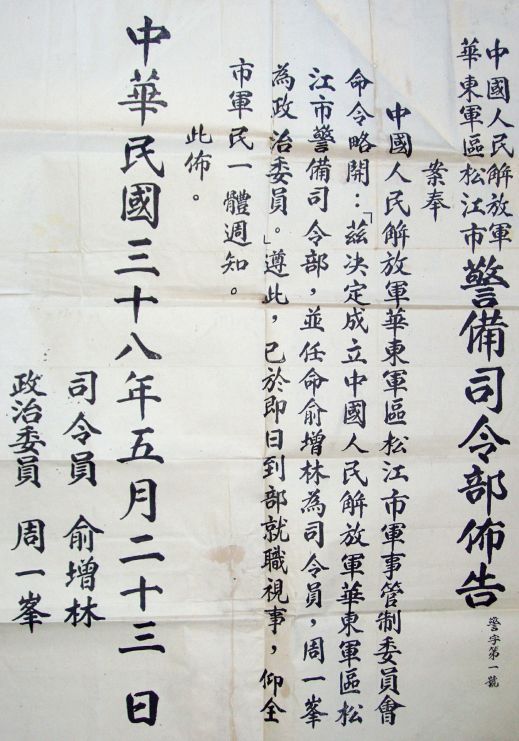 图片说明:1949年5月23日,关于成立中国人民解放军华东军区松江市警备司令部的布告