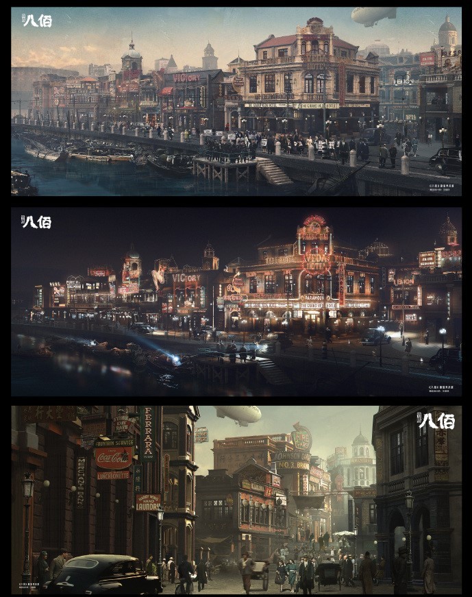 但是我们这个戏,难点不是要设计得多好看多复杂,而是要考虑怎么在有限成本下做出好的气质。其实我们做到一半的时候,街道已经越做越大了。印象中当时美术指导林木老师跑过来看到街道目前的体量,在旁边很无奈地苦笑调侃,“咱们这个街道都快跟《八佰》体量一样啦”。因为美术组大多数都是从《八佰》出来的,都经历过那个体量的项目,在能力和经验上其实都非常棒了,主要难点还是怎么在有限的成本下做出不逊色于《八佰》的美术设计,这个比较难。