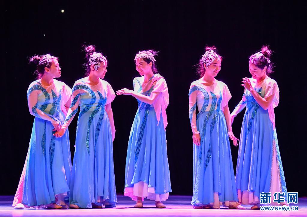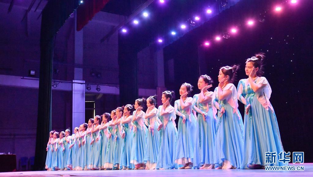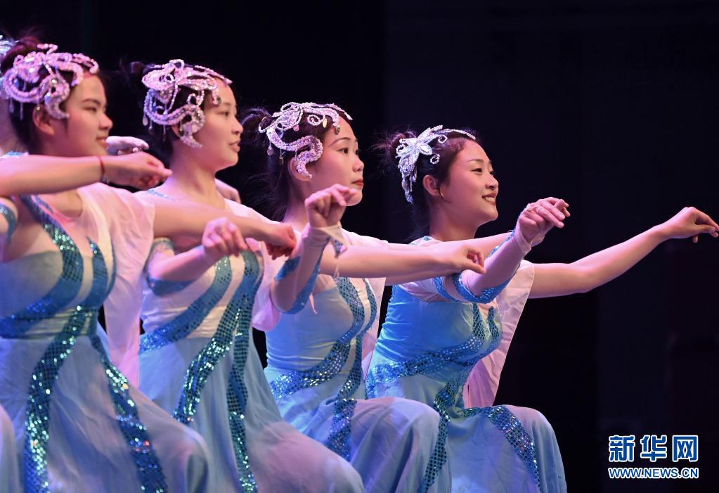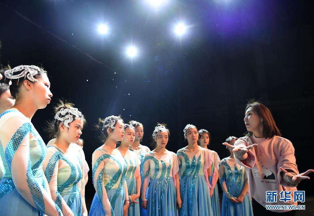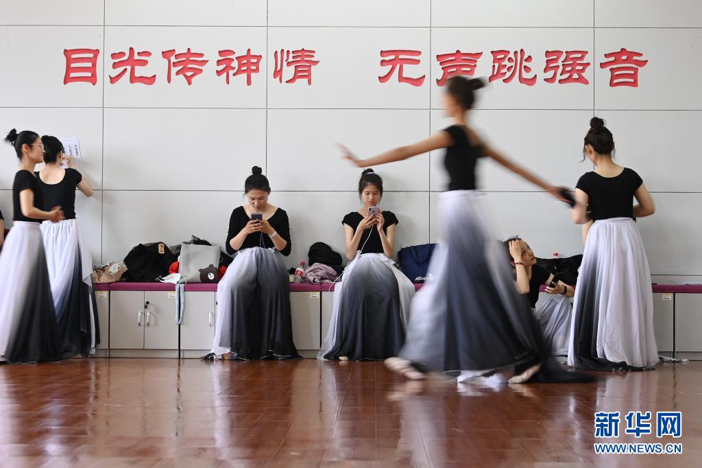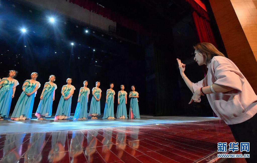天津理工大学聋人工学院的舞蹈队员们在学校的剧场里进行彩排(5月10日摄)。