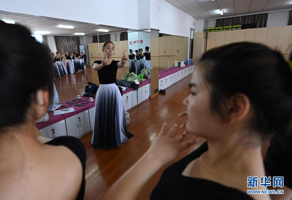 在天津理工大学的剧场里,天津市残疾人文艺体育训练指导中心舞蹈老师韩菲用手语为学生指挥(5月10日摄)。新华社发(孙凡越摄)