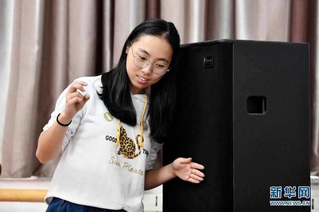 天津理工大学聋人工学院聋人舞蹈队队长杨凝在排练时用手接触音响感受震动(5月12日摄)。新华社记者 赵子硕 摄