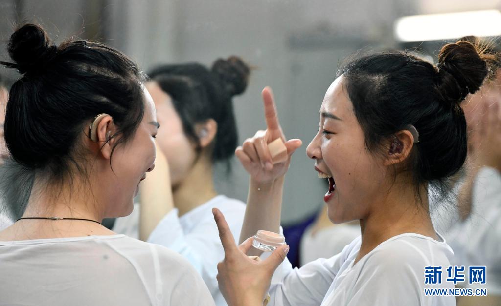 天津理工大学聋人工学院的舞蹈队员们在学校的剧场里化妆时交流(5月10日摄)。新华社记者 赵子硕 摄