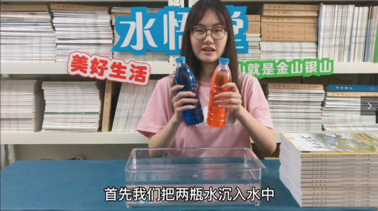 首先我们把两瓶水沉入水中,然后在水中打开盖子,红色的热水上升到了水面,而蓝色的冷水则下沉到了水底。