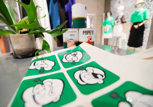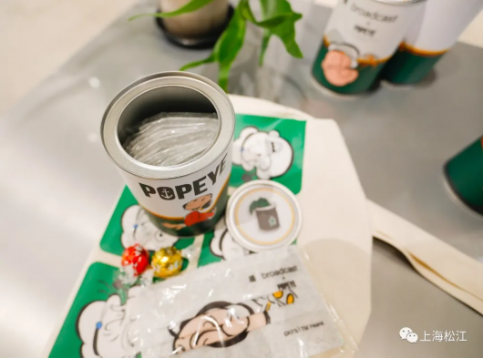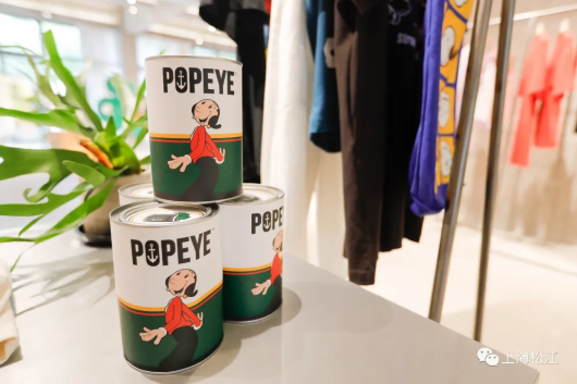 除了各类衍生产品外,体验空间内还有与其它品牌联名的限量产品。今年,播与大力水手联名的不少单品销量与口碑俱佳。展示柜上还有定制的联名矿泉水,供顾客购物时享用。