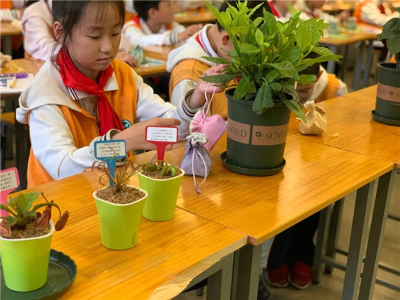 老师们还为大家带来了几种特别的植物和草药,有美人齿捕蝇草、红宝石猪笼草、明月草……还有白芷、小茴香、丁香等,同学们通过近距离的看一看、摸一摸、闻一闻等形式,近距离感受中草药的神奇。