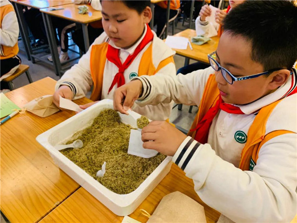 中药香囊一般采用芳香中药材作为配料,比如丁香、沉香、艾叶、肉桂、苍术等,有清香、驱虫、防病的功能。老师们拿出事先打磨成粉状的草药,引导同学们把它装进无纺布小袋中,再把袋口翻过来,一个草药包就做好了,最后把它装进袋里,香囊就制作完成啦!同学们跃跃欲试,在老师手把手的指导下小心翼翼地将草药粉末装进布袋,不一会儿,一个个漂亮的香囊就做成了!