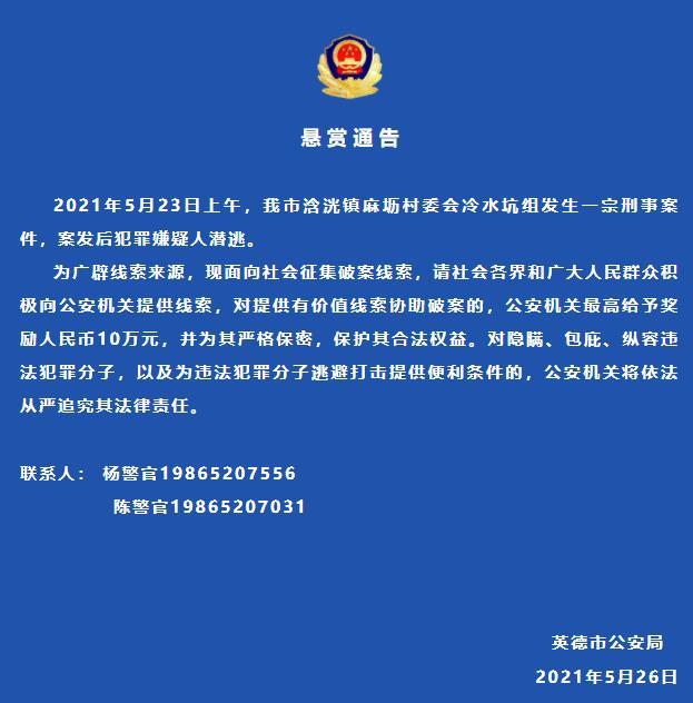 英德市公安局5月26日发布悬赏通告称,5月23日上午,该市浛洸镇麻坜村委会冷水坑组发生一宗刑事案件,案发后犯罪嫌疑人潜逃。为广辟线索来源,现面向社会征集破案线索,请社会各界和广大人民群众积极向公安机关提供线索,对提供有价值线索协助破案的,公安机关最高给予奖励人民币10万元,并为其严格保密,保护其合法权益。对隐瞒、包庇、纵容违法犯罪分子,以及为违法犯罪分子逃避打击提供便利条件的,公安机关将依法从严追究其法律责任。
