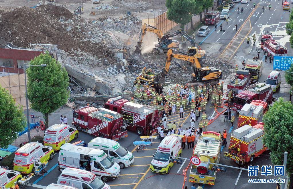 6月9日,救援人员在韩国光州建筑倒塌现场工作。