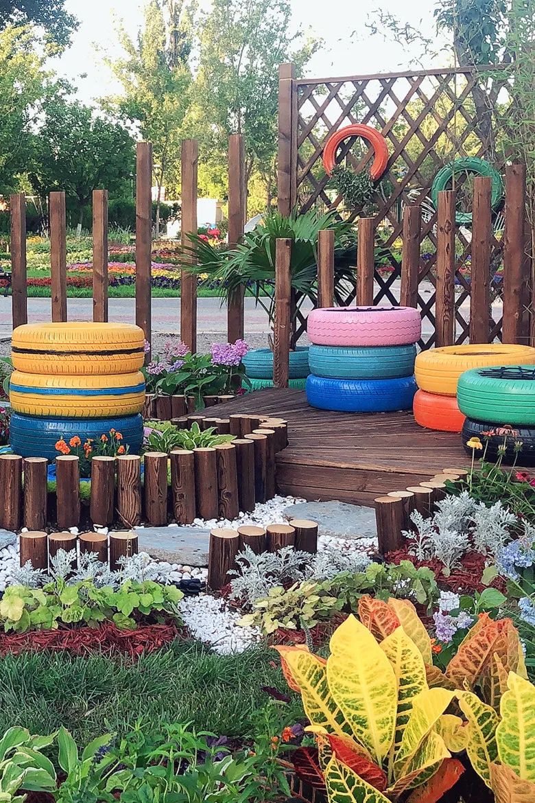 设计理念:利用废弃轮胎做主要材料,做成秋千、跷跷板、椅子、花盆等不同功能形态各异小品,以轮胎的“硬”,结合植物的“柔”,倡导环保理念,引导园艺生活新方式。