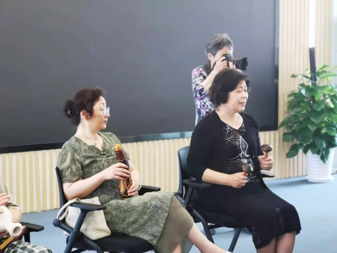 经过短暂的熟悉后,老师用青铜铃带领着大家有规律的敲打弹奏。时而轻盈、时而响亮,由慢到快、由浅至深。