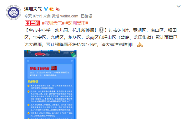 深圳发布暴雨红色预警 全市中小学、幼儿园等停课