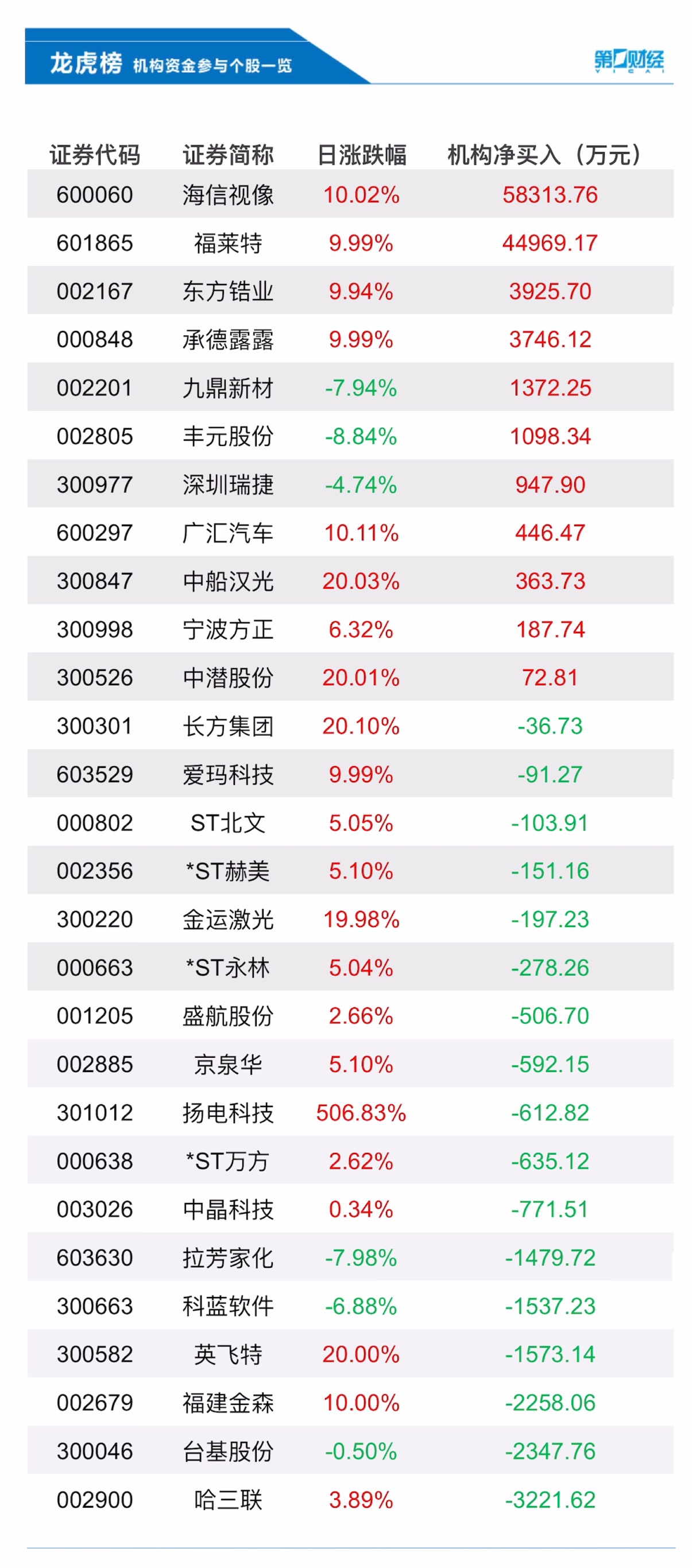 当天机构净买入前三的股票分别是海信视像、福莱特、东方锆业,净买入金额分别是5.83亿元、4.5亿元、3926万元。