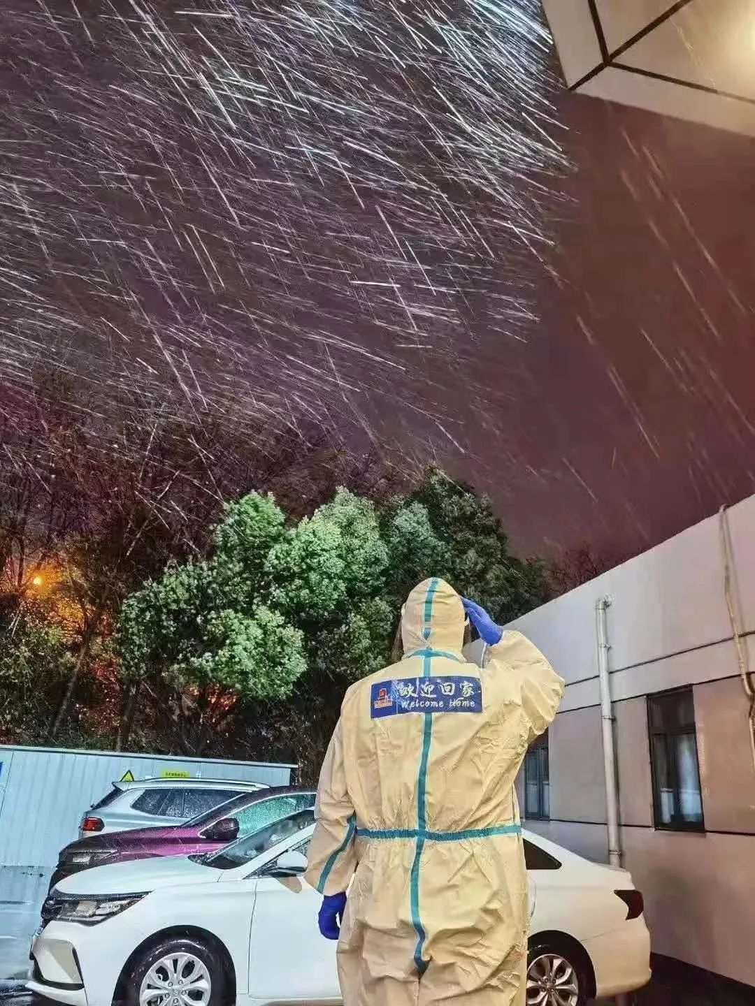 2020年12月29日深夜,一场“霸王级”寒潮突降申城,气温断崖跌至零下。大风呼啸,寒雨夹雪。在位于宝山区顾村镇辖区内的某集中隔离点里,雨雪之下肃然站立着4位身着防护服的医护人员,那一夜,他们为57位入境人员先后办理了入住手续。