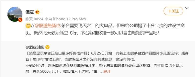 有网友认为,茅台需要飞天之上的大单品,但总给公司提了十分宝贵的建设性意见,既然飞天必须低空飞行,茅台就推移推一款可以自由翱翔的产品吧!