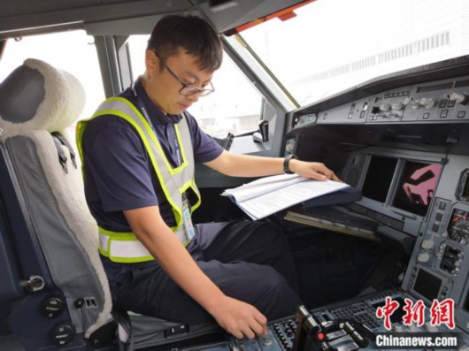 李辉在飞机驾驶舱内检查仪表设备。受访者供图