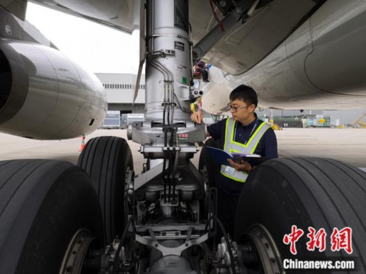 李辉在检查A330飞机起落架和刹车系统。受访者供图