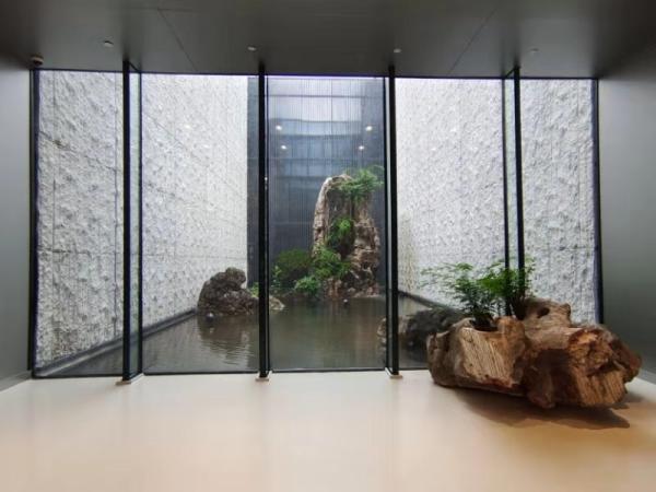 艺术馆内有一处类似天井的山石造景,富有意趣,在一楼二楼都可以看到,阳光下的涟漪可以令人驻足许久。