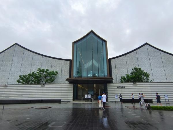 绍兴徐渭艺术馆就在青藤书屋北侧,今年五月份正式对外开放,正逢徐渭诞辰五百年,集合了国内诸多文博单位的真迹,算是迄今为止规模最大的青藤老人个展了。初见绍兴徐渭艺术馆,整体外观还是挺惊艳的,富有设计感的现代展馆形制,艺术馆和游客中心都是统一的设计风格,设计者将国画中的“山”和“水”具象化:艺术馆外形以山势起伏相呈现,搭配徐渭塑像后轻薄流动的水层斜坡。