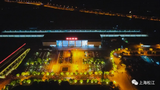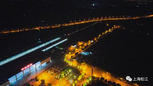 松江南站灯光映射、高铁穿梭,构建“四网融合”的综合交通体系,对标最高标准和最高水平,规划建设松江枢纽核心功能区,闪耀的光芒仿佛照亮现在与未来。