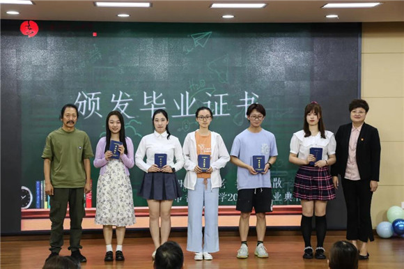 顾校长与齐校长为高三毕业生代表颁发毕业证书。