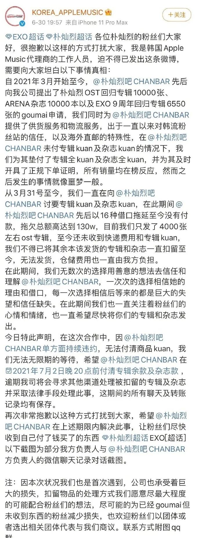 当天,韩国Apple Music代理商也发文,称从今年3月份开始被“朴灿烈吧”拖欠各类垫付款130万元,对方先后以16种借口拖延至今。