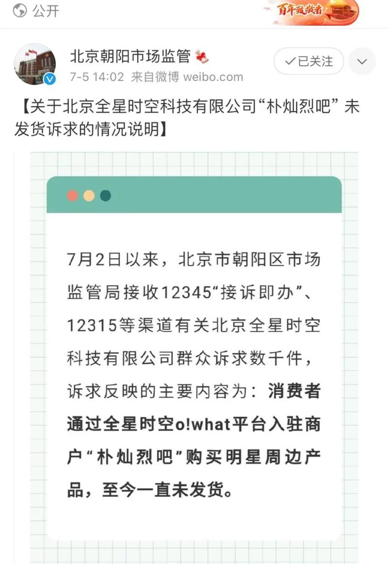 对此,北京市朝阳区市场监管局紧急约谈全星时空公司。该公司承诺,将组织消费者向北京、张家港、成都三地警方报案,帮助粉丝共同维权。7月4日,该公司向青岛某供货商先行支付部分费用,正在陆续发货中。