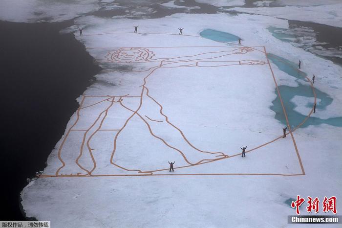资料图:艺术家约翰奎格利在北极海冰上制作了一幅达芬奇名画“维特鲁威人”,以此呼吁人们关注自然,关注气候。