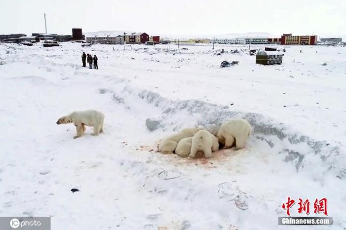 资料图:全球气候暖化对生态影响加剧,俄罗斯北部楚科奇自治区雷尔凯皮村附近出现60多只北极熊。由于全球变暖导致海面冰层变薄,北极熊不得不闯入人类村落觅食。