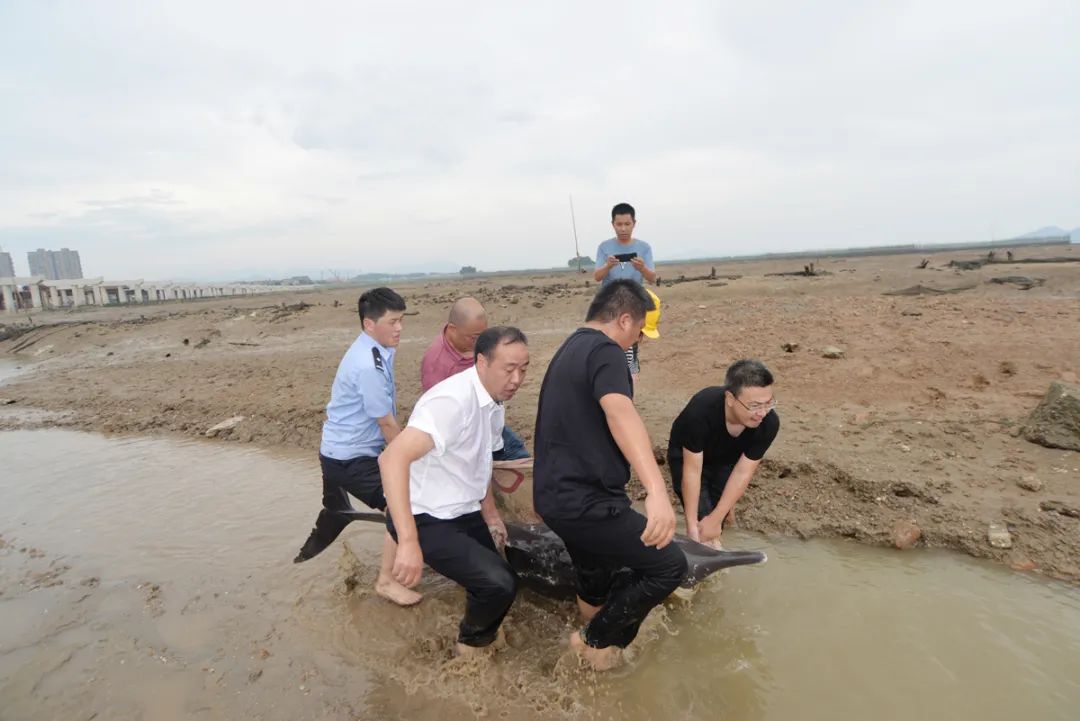当时正值海水退潮,因担心退潮后更不利于海豚返还深水区,民警和镇综合执法局、应急管理局、农办等多部门的救援人员在专业人士指导下开展营救,试图在最短时间内将海豚送到深海处。